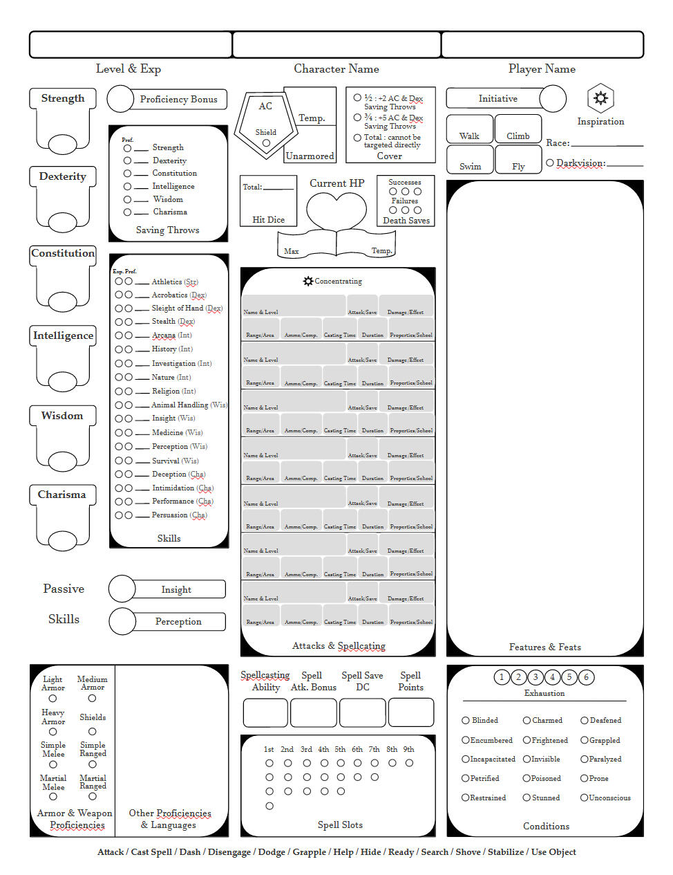 This free player character sheet is compatible with both classless and classed 5E PCs.